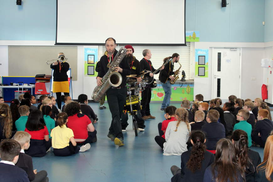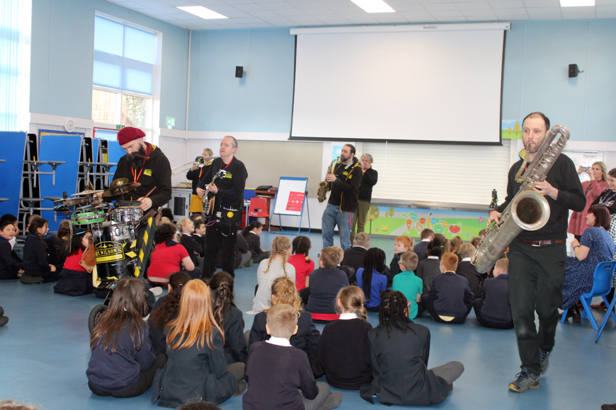 90s brass band takeover Cobholm Primary Academy's assembly with Music Masterclass